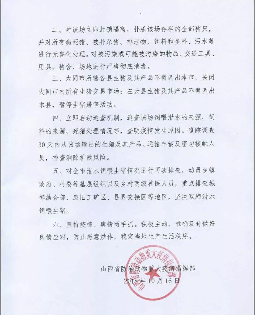 10月17日12时,农业农村部接到中国动物疫病预防控制中心报告,经中国动物卫生与流行病学中心(国家外来动物疫病研究中心)确诊,山西省大同市左云县一养殖户排查出非洲猪瘟疫情。该养殖户存栏生猪15头,发病7头,死亡4头。