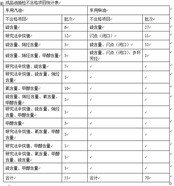 在抽检不合格的121个批次中,涉及到7项不合格技术要求,分别是:硫含量高(标准值不大于10mg/kg),闪点(闭口)低(标准值不低于60℃),多环芳烃含量高(标准值不大于7%),研究法辛烷值低(标准值不小于汽油型号),甲醇含量高(标准值不大于0.3%),氧含量高(标准值不大于2.7%),烯烃含量高(标准值VIA不大于18%)。