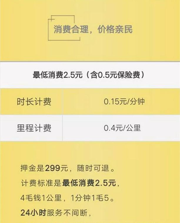 可以可看出这款共享电动车需要交押金299元,这个押金额和摩拜单车是一样的都是299元。我们再看它的收费标准,0.4元一公里或1分钟0.15元,但是计费标准最低是2.5元。也就是骑一次不关你走没走都要交2.5元,这个比一般共享单车贵1.5元,毕竟共享电动车的成本也是普通单车的几倍。